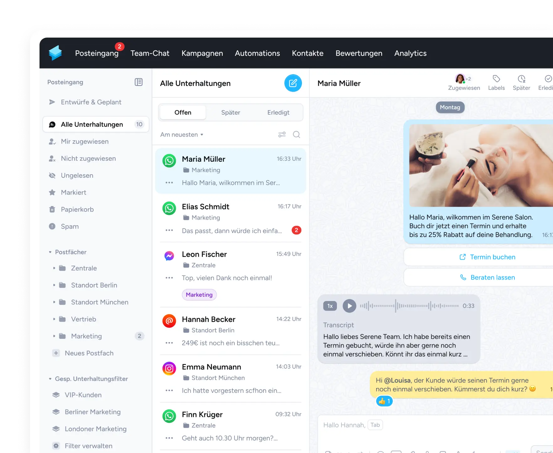 Bündeln Sie alle eingehende Nachrichten aus verschiedenen Kanälen wie WhatsApp, Instagram, Facebook Messenger, Live-Chat, E-Mail und Telegram in einem universellen Posteingang.